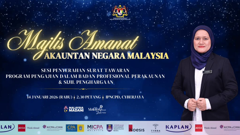 Dimaklumkan bahawa Institut Perakaunan Negara (IPN) akan mengadakan Majlis Amanat Akauntan Negara Malaysia (ANM), Sesi Penyerahan Surat Tawaran Bagi Program Pengajian Dalam Badan Profesional Perakaunan Jabatan Akauntan Negara Malaysia (JANM) & Sijil Penghargaan seperti ketetapan berikut: